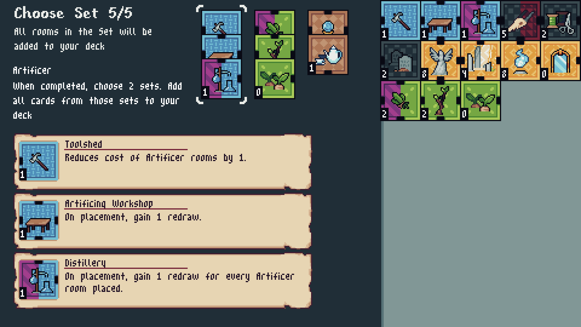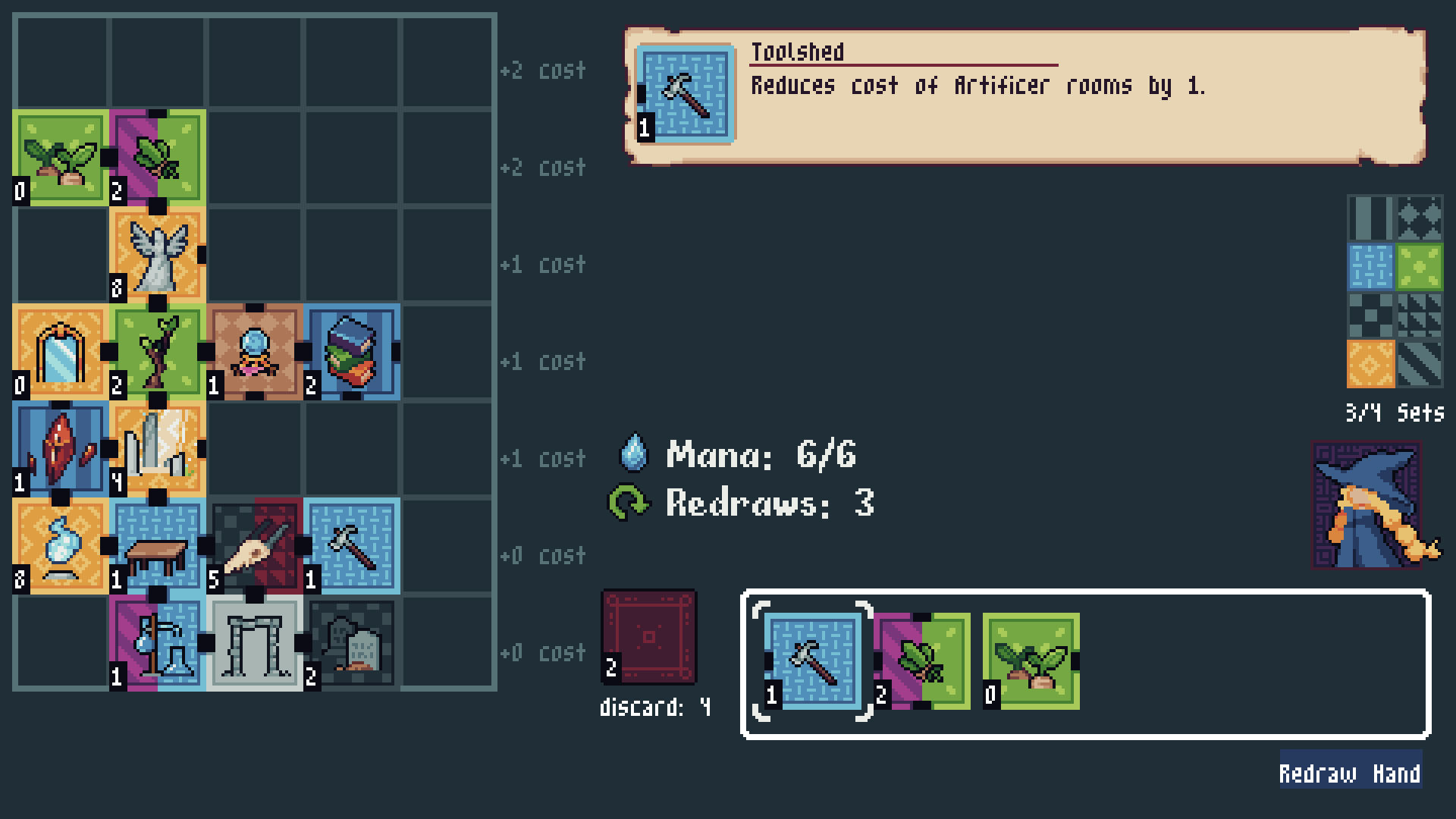 Place down rooms to try to complete 4 room sets while balancing room connections and mana. Made for Ludum Dare 58 with the theme "Collector".